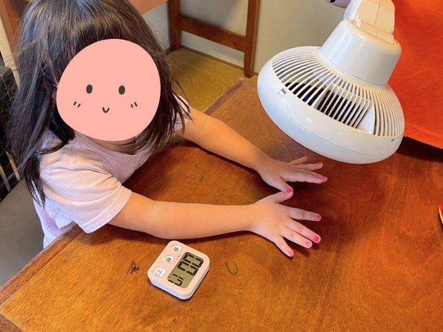 テーブルに手を置きながら、風で乾かす姿は、まるで本格的なサロン気分!
