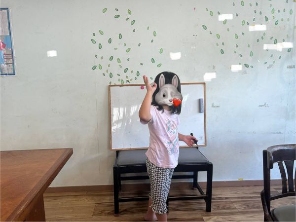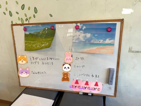 子ども達が来る前に机をコの字にします。ホワイトボードを真ん中に置いて目立つようにすると、活動前にそれを見た子が前に立ってボードマーカーを持って先生役をしています。かわいらしい姿が見れました。