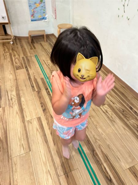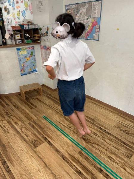 まず、スタッフが床に引かれている一本線上を音楽に合わせてジャンプします。