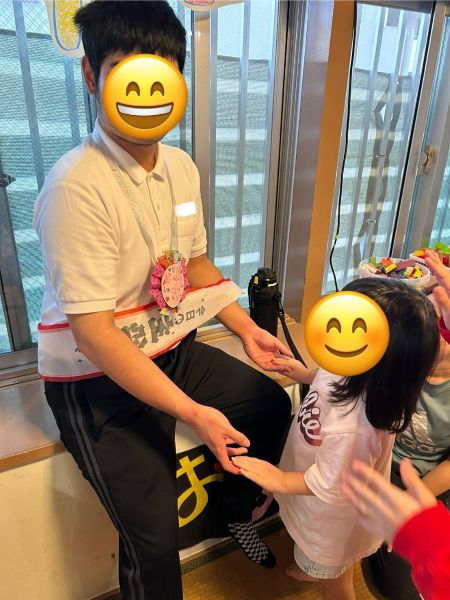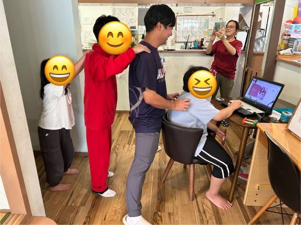 途中、ゲームしている子をスタッフが肩もみしてそのスタッフを子ども達が肩もみして四人一列になる場面があってかわいかったです。