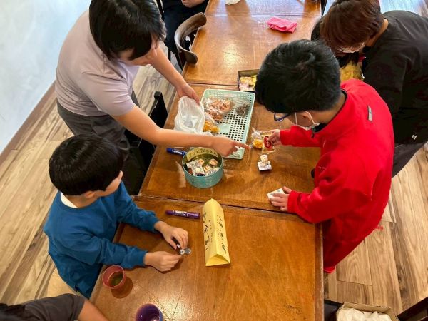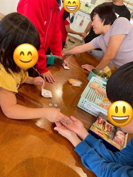 スタッフが子どものお客さんが手に取ったお菓子を「一、二、三百円ですね。」と確認しながら言って、お会計役の子どもにパスすると、その子がお金を受け取ります。