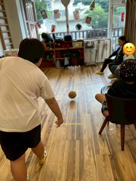 今日はボウリングをしました。テーブルを寄せて、ペットボトルのピンを並べます。