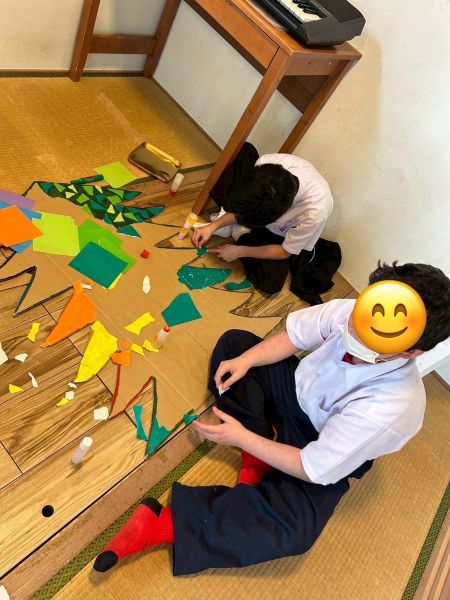 ツリー作りに参加した男の子二人は、片方の子が相手の子の作っているのを見て「おぉー、いいね!色んな色があって綺麗だね」と相手の子のすごい所を言葉にして伝え、言われた方も嬉しそうに自信を持って製作に集中していました。