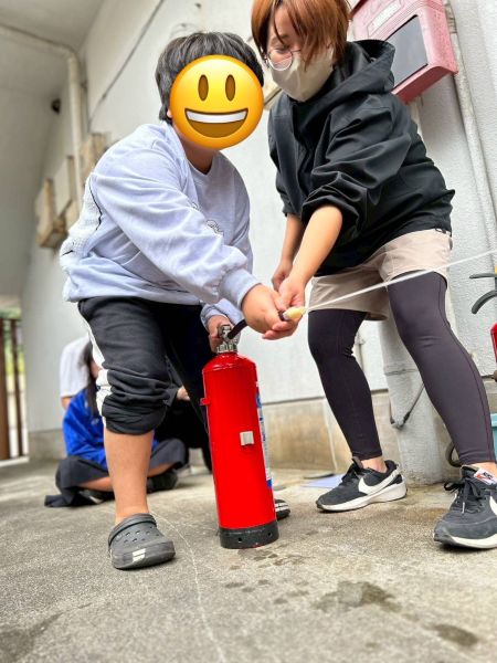 その後に実際に避難して消防署から借りてきた水消火器を使って消火活動をします。