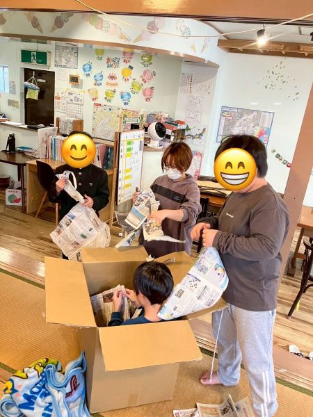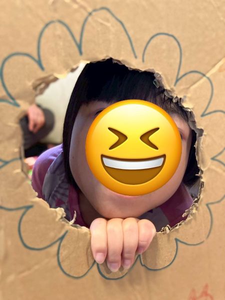 他の所では、段ボールの箱に入っている子が居て、「何か入れて~」と言ったので「新聞紙がいいんじゃない?」となり、数人で新聞紙を破いて中に入れます。ちょうどその時に「アナと雪の女王」の曲を流してたので、新聞紙を破ったものを「ありの~♪」の時に雪をまく感じでばらまいて楽しんでいます。