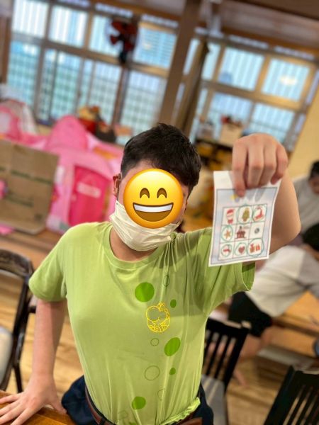 はじまるのを待ちきれない様子だったのでスタッフがその都度、「(ビンゴを)引いてもらっていい?」「みんなに見せてあげて」「○○にお菓子を持って行ってあげて」と少しずつお願いすると、与えられた役割を行い手伝いをしてくれます。
