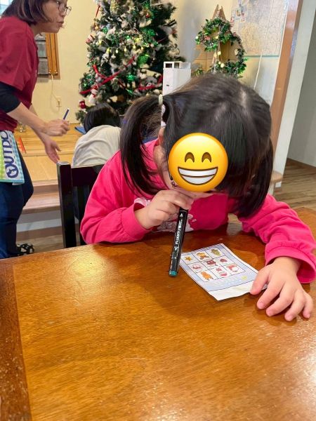 ビンゴが当たってお菓子をもらった後も自分で続けており、途中で終わろうとすると「残りの全部引いていい?」と手持ちのカードを全部埋めたかった様子で全部が埋まると納得して片付けをして終わりの挨拶をします。