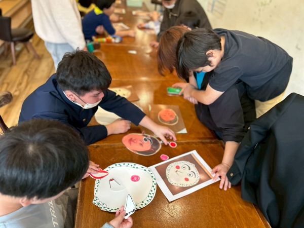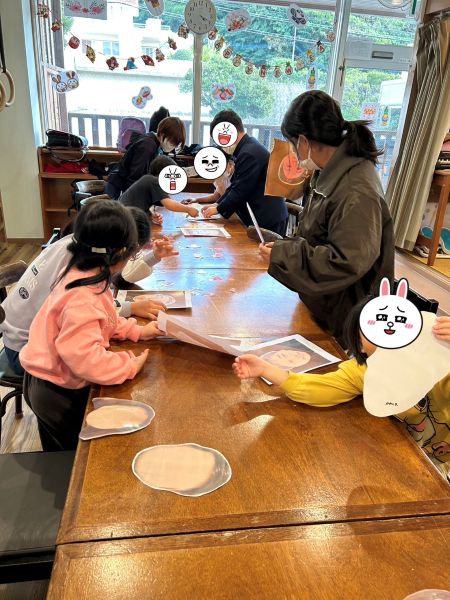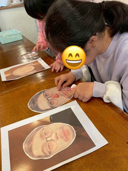 活動の始めにスタッフがおカメさんやひょっとこの出来上がった写真を見せると、男の子が「めぐちゃん!」「しんたろう!」と名前を付けます。それをスタッフが「正解!」と冗談に乗って良い雰囲気からスタートしました。