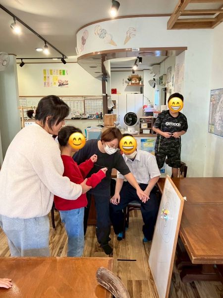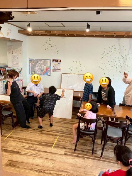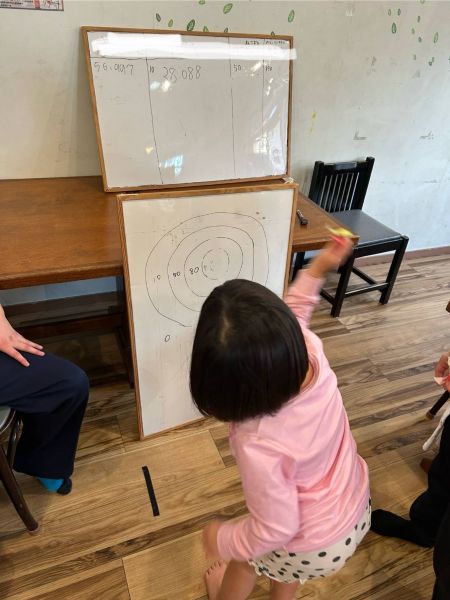 はじめに「ダーツ分かる人~?」「わからない人のために教えるね」とスタッフがやり方を見せようとすると、急に男の子が背中をスタッフに向けてきて的に成りきりだします。スタッフが「みえない!笑」というやり取りで場が明るくなります。ホワイトボードの的は、子どもとスタッフが事前に書いてくれて助かりました。