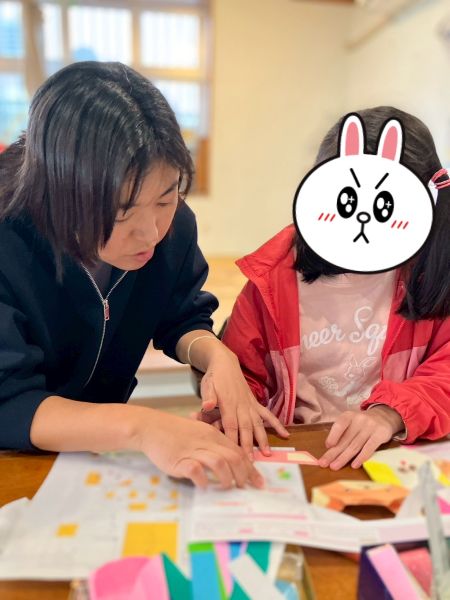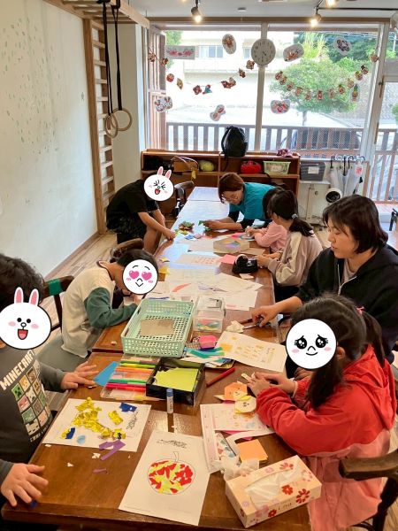 始めは、何を作ろうかイメージがあまりついていなかった子も周りのスタッフと話したり、実際におりがみを触る中で、キリンのイラストに金のおりがみをちぎって貼って輝くちぎり絵ができたり、りんごのイラストに青系の色を塗って「毒リンゴ」という名の綺麗なリンゴが出来ています。
