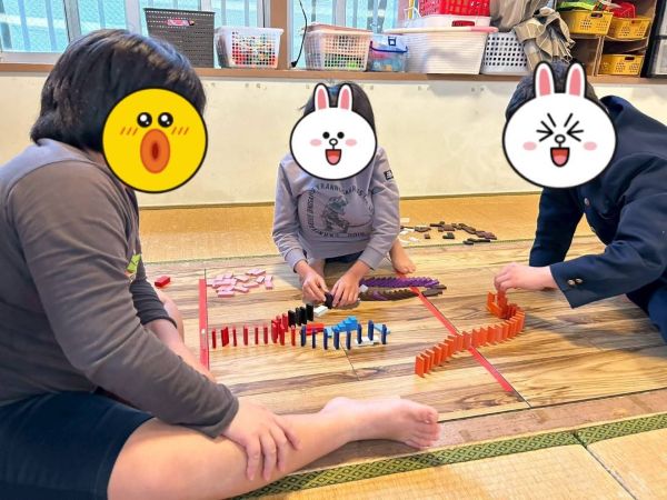 始める合図をすると、畳間に広げてたドミノから三人の男の子が好きな色のドミノを選び出しやり始めます。各々で色は選びますが作っているのは一つの物みたいでした。