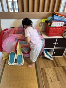 今日は、タオルケットトンネルや、ビニールトンネルを通るサーキットをしました。 子ども達が来る前にスタッフがサーキット会場を準備して設置しています。 はるかぜに着いてビニール袋で作ったトンネルを見るなり「俺の家!」と言って […]