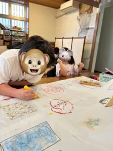 今日は、福祉フェスタに出すポスターを描こうというのをやりました。 大きな紙を机に用意しています。 はじめは、「やらない?」に対して「いいよ」と否定的だった子も「自分(スタッフ)が描くからお祭りのイメージ教えて頂戴」 と言 […]
